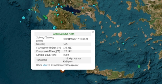 Σεισμική δόνηση 4,5 Ρίχτερ σημειώθηκε ανοικτά της Κρήτης, με το επίκεντρο να εντοπίζεται νοτιοδυτικά των Κυθήρων. Η δόνηση καταγράφηκε σε θαλάσσια περιοχή, γεγονός που συνιστά συνήθως λιγότερη ανησυχία για τους κατοίκους των γύρω περιοχών.