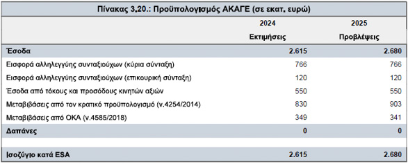Παραθέτουμε τον άκρως αποκαλυπτικό Πίνακα 3.20 (σελίδα 166) της Εισηγητικής Έκθεσης του Υπουργείου Οικονομικών για τον Κρατικό Προϋπολογισμό του 2025 αναφορικά με τον προϋπολογισμό του ΑΚΑΓΕ και τον αντίστοιχο του περσινού Κρατικού Προϋπολογισμού 2024 (Πίνακας 3.19, σελίδα 169).