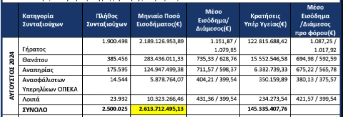 Αποκαλυπτικός είναι ο Πίνακας 1 (σελίδα 4) από τα επίσημα στοιχεία του Ενιαίου Συστήματος Ελέγχου και Πληρωμών Συντάξεων (ΕΣΕΠΣ) του Πληροφοριακού Συστήματος «ΗΛΙΟΣ» από την ΗΔΙΚΑ ΑΕ και το ΥΠΕΚΑ. Στην πλέον πρόσφατη «Μηνιαία Απεικόνιση Συνταξιοδοτικών Παροχών» που δημοσιεύουν και αφορά τον Αύγουστο 2024, αποτυπώνονται οι κρατήσεις υπέρ υγείας που ανέρχονται σε περίπου 145 εκατ. € τον μήνα, ποσό που σε ετήσια βάση (145.335.407 Χ 12) ανέρχεται σε 1.744.024.884€ (1.744 εκατ. €).