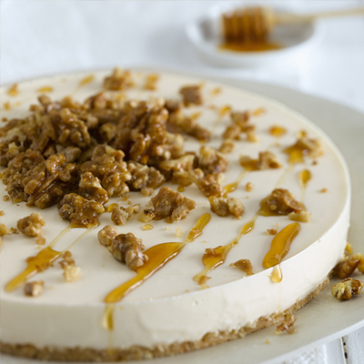 Σε ένα τηγάνι, βάζετε τα καρύδια, 20 γρ ζάχαρη και 2 κουταλιές της σούπας νερό. Το βάζετε στη φωτιά και ανακατεύετε μέχρι να εξατμιστεί το νερό και να καραμελώσουν τα καρύδια. Προσθέτετε ένα κουταλάκι του γλυκού βούτυρο και ανακατεύετε για ακόμα 1 με 2 λεπτά. Αφήνετε τα καραμελωμένα καρύδια σε μια λαδόκολλα να κρυώσουν. Διακοσμείτε το Cheesecake με τα καραμελωμένα καρύδια και το μέλι.