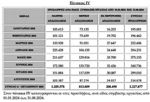Αναφορικά με τον Αύγουστο 2024, όπως προκύπτει από τον Πίνακα Ι, οι απολύσεις ήταν κατά 5.081 περισσότερες από τις προσλήψεις (214.648 οι προσλήψεις, 219.759 οι «αποχωρήσεις») και μάλιστα στο αποκορύφωμα της τουριστικής περιόδου.
