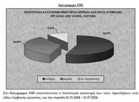 Εξάλλου, ο Πίνακας IV για τον Ιούλιο 2024 και το Διάγραμμα VIII της Έκθεσης για τις «Ροές Μισθωτής Απασχόλησης στον Ιδιωτικό Τομέα» για το επτάμηνο Ιανουάριος-Ιούλιος 2024, αποτυπώνει τη θλιβερή παρούσα κατάσταση στην αγορά εργασίας: Η μερική και η εκ περιτροπής απασχόληση κυριαρχούν στην ελληνική αγορά εργασίας.