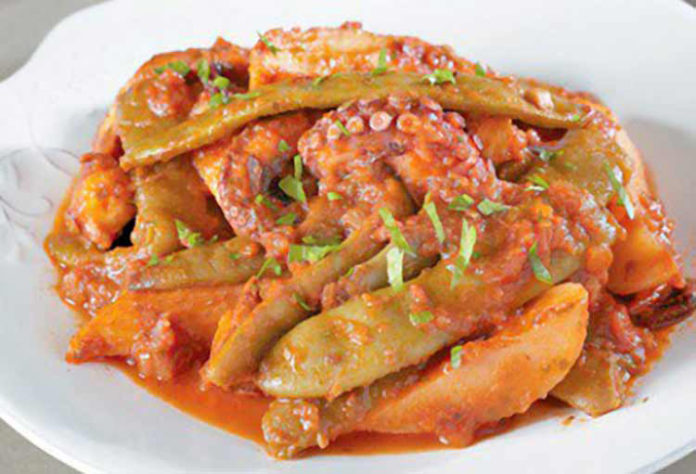 Κόβουμε το χταπόδι σε μικρά κομμάτια και τα βάζουμε στην κατσαρόλα μαζί με τα ζουμάκια του. Χαμηλώνουμε τη φωτιά και συνεχίζουμε το μαγείρεμα μέχρι να μαγειρευτούν και τα λαχανικά. Προς το τέλος ανακατεύουμε στο φαγητό και τον μαϊντανό.