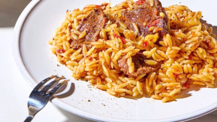 Σε μια κατσαρόλα με μπόλικο νερό που βράζει βάζουμε το κριθαράκι χωρίς γλουτένη και το βράζουμε μέχρι να μαλακώσει αλλά όχι εντελώς. Με αυτόν τον τρόπο το κριθαράκι μας δεν θα λασπώσει. Σουρώνουμε το κριθαράκι και το αδειάζουμε στο ταψί μας, προσθέτουμε το κοκκινιστό μοσχάρι και περιχύνουμε με όλη τη σάλτσα.