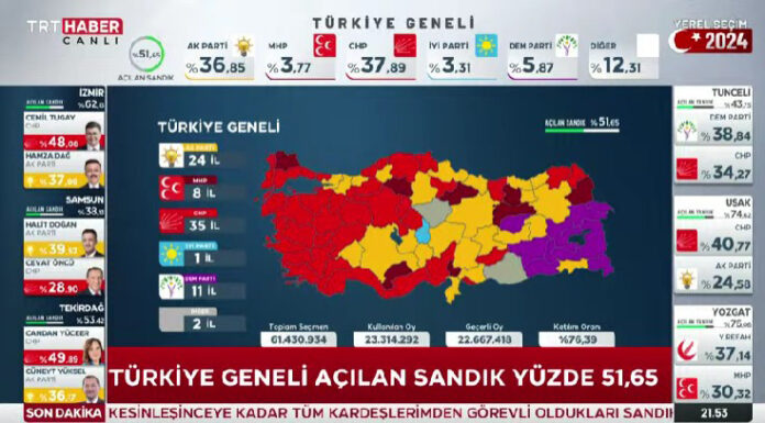 - Το κυβερνών κόμμα AKP, του Προέδρου Ερντογάν, έχασε την επικράτεια των Δήμων, με ποσοστά: