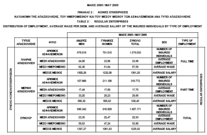 Από τον παρακάτω παρατιθέμενο Πίνακα 0.2(σελ. 3) που εμπεριέχεται στα «Μηνιαία Στοιχεία Απασχόλησης ΙΚΑ-ΕΤΑΜ» για τον Μάιο 2009 προκύπτει ότι τον Μάιο του 2009 με μερική απασχόληση εργάζονταν 318.772 άνθρωποι σε σύνολο 1.907.171 ασφαλισμένων (ποσοστό 16,7%).
