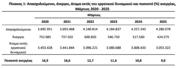 Η Ελληνική Στατιστική Υπηρεσία (ΕΛΣΤΑΤ) ανακοίνωσε 424.575 (ποσοστό 9%) για τον Μάρτιο 2025, δηλαδή αυξημένη ανεργία κατά 20.940 ανθρώπους (ποσοστό +0,4%) σε σχέση με τον Φεβρουάριο 2025 που ήταν 8,6%!!
