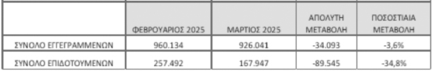 Από την πλευρά της η Δημόσια Υπηρεσία Απασχόλησης (ΔΥΠΑ- πρώην ΟΑΕΔ) ανακοίνωσε (Πίνακας 2: Μεταβολές Εγγεγραμμένων και Επιδοτουμένων»), για τον ίδιο μήνα, 926.041 άτομα (ποσοστό 20,2%), δηλαδή μειωμένη ανεργία κατά 34.093 ανέργους (ποσοστό -0,8%) σε σχέση με τον Φεβρουάριο 2025 που ήταν 21%!!
