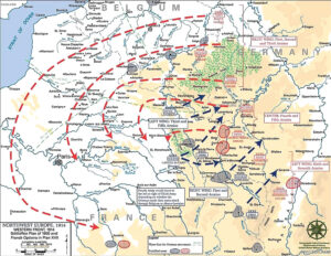 Το γερμανικό επιτελείο δεν σχεδίαζε σε καμία περίπτωση τη διάσπαση της «Γραμμή Μαζινώ». Το ίδιο έπραξε, όταν την 6η Απριλίου 1941 επιτέθηκαν κατά της Ελλάδος, παρακάμπτοντας τα οχυρά της «Γραμμής Μεταξά», κινούμενοι μέσω Σκοπίων. Προς τούτο επέλεξε να επιτεθεί μέσω Βελγίου, με αντικειμενικό σκοπό τη κατάληψη της Βορείου Γαλλίας, όπως έπραξε κατά το Α΄ Παγκόσμιο Πόλεμο, εφαρμόζοντας τον ελιγμό του «Σχεδίου Σλίφεν (Schlieffen-Plan)». Το σχέδιο έφερε την κωδική ονομασία «Κίτρινο Σχέδιο». Τα γερμανικά στρατεύματα κατανεμήθηκαν σε 3 «Ομάδες Στρατιών», με διάταξη από βορρά προς Νότο: Β ΄ Ομάδα Στρατιών υπό το Στρατηγό Φέντορ Φον Μποκ, Α΄ Ομάδα Στρατιών υπό το Στρατηγό Γκέρντ Φον Ρούστεντ και Γ΄ Ομάδα Στρατιών υπό το Στρατηγό Βίλχελμ Φον Λέεμπ. Τα μεγέθη και οι αριθμοί και μόνο προκαλούν ίλιγγο.