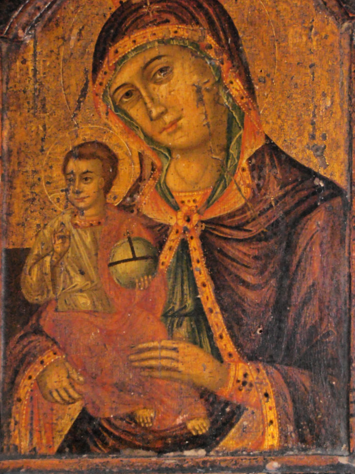 Σιγά-σιγά αυτή η αίσθηση γίνεται μια πρωτόγνωρη ευλάβεια και συγκίνηση, καθώς η ματιά σου αγκιστρώνεται στο βλέμμα της Μητέρας και μαγνητισμένη χάνεται στο απύθμενο βάθος του. Ένα βλέμμα τόσο θλιμμένο, που λες και κρύβει μέσα του τον πόνο και την υπομονή όλων των μανάδων της οικουμένης. Και τότε αρχίζεις να διακρίνεις εκεί στις άκρες των ματιών της κάποια σημάδια, σαν πνιγμένα δάκρυα. Μικρές καφετιές σταγονίτσες αναβρύζουν άτακτα και στολίζουν μέχρι χαμηλά τις παρειές της. Μοιάζουν με πιτσιλιές που ξέφυγαν σε μια αδέξια κίνηση του ζωγράφου, καθώς χρωμάτιζε την καστανή ίριδα των ματιών της. Εκεί που τελειώνουν οι μικρές κηλίδες, ένα βαθύ σημάδι στο αριστερό της μάγουλο ραγίζει την ηρεμία του προσώπου της. Καταλήγει σε μια γραμμή, σαν μαχαιριά, που αυλακώνει λοξά το εικόνισμα και σβήνει στις πτυχές της πορφυρής εσθήτας της.