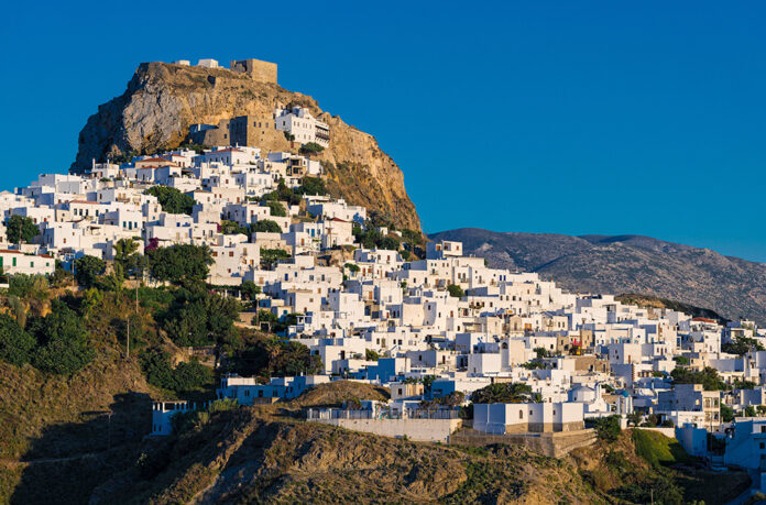 Παραδοσιακή αρχιτεκτονική, γραφικά ολόλευκα σπίτια το ένα ακριβώς δίπλα στο άλλο, στενά σοκάκια, περιποιημένες αυλές, πολλές εκκλησίες σε οικισμούς και στο ψηλότερο σημείο το Κάστρο είναι το κάδρο που συνθέτει τη Χώρα του όμορφου νησιού.