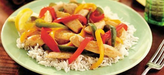 Κοτόπουλο με χρωματιστές πιπεριές και ρύζι μπασμάτι
