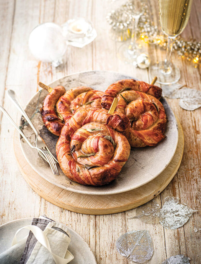 Με ένα πινέλο αλείφουμε όλα μας τα λουκάνικα με το μείγμα από ελαιόλαδο, μέλι και μουστάρδα. Τέλος, περνάμε λίγα φυλλαράκια φρέσκου φασκόμηλου ενδιάμεσα από τα λουκάνικα και το μπέικον.