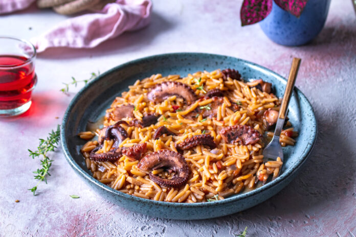 Μόλις το κριθαράκι απορροφήσει την πρώτη δόση υγρών, χαμηλώνουμε τη φωτιά, και προσθέτουμε το υπόλοιπο νερό, ανακατεύοντας κάθε τόσο. Όταν αρχίσει να μελώνει το χταποδάκι, αλλά πριν στεγνώσει, αποσύρουμε απο τη φωτιά. Προσθέτουμε το υπόλοιπο ελαιόλαδο, τις ελιές και το μαϊντανό και ανακατεύουμε απαλά.