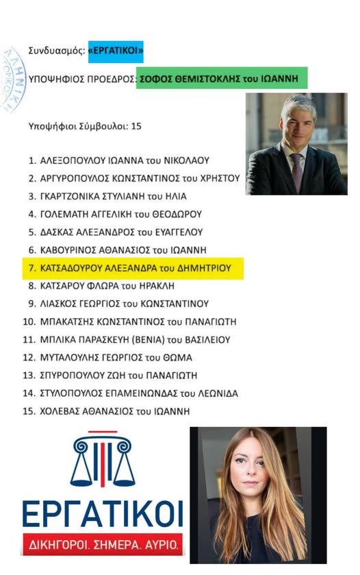 Με βαθιά συναίσθηση της ευθύνης και με πίστη στις αξίες που θεμελιώνουν το λειτούργημα του Δικηγόρου, η Αλεξάνδρα Κατσαδούρου του Δημητρίου ανακοινώνει την υποψηφιότητά της για τις εκλογές της 30ης Νοεμβρίου και 1ης Δεκεμβρίου, με τον συνδυασμό «ΕΡΓΑΤΙΚΟΙ» και υποψήφιο Πρόεδρο τον Θέμη Σοφό.