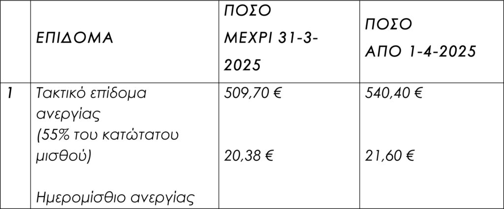 Από 1-4-2025, αύξηση θα παρουσιάσουν και 34 εργατικά και κοινωνικά επιδόματα-παροχές, που είναι για δεκαετίες συνδεδεμένα με το ύψος τού κατώτατου μισθού και χορηγεί κυρίως η ΔΥΠΑ (τέως ΟΑΕΔ) ή προβλέπει η Εργατική Νομοθεσία (Π.Δ. 80/2022).