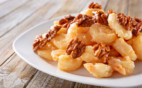 Σερβίρετε πάνω από ρύζι με τα ζαχαρωμένα καρύδια και γαρνίρετε με φρέσκα κρεμμυδάκια.