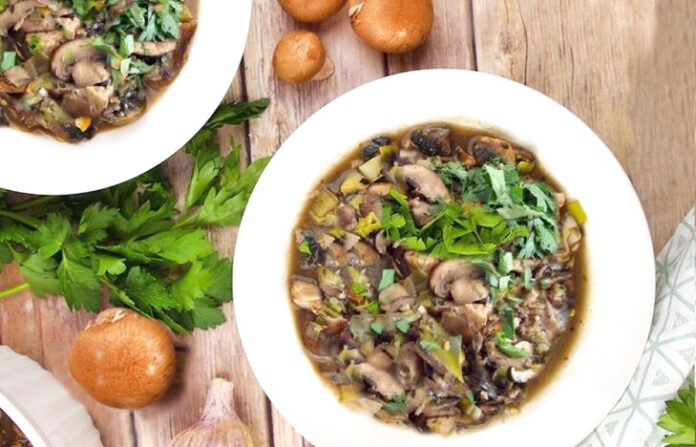 Καθαρίζετε και πλένετε καλά τα μαρούλια.Τα ψιλοκόβετε και αφήνετε να στραγγίσουν. Βάζετε σε κατσαρόλα τα κρεμμυδάκια και τα μανιτάρια ψιλοκομμένα και τα μαραίνετε. Προσθέτετε τα μαρούλια, μυρωδικά, το ρύζι και αφήνετε να βράσουν. Σερβίρετε ζεστά.