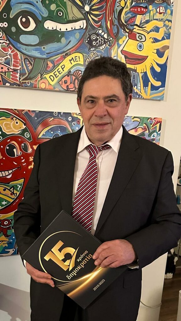 o Μάκης Σεριάτος με το επετειακό τεύχος της Δημοκρατίας 'ανα χείρας"
