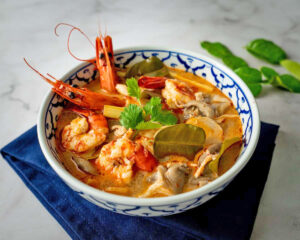 Πρέπει να δοκιμάσετε οπωσδήποτε Tom yam Kung. Μιλάμε για ένα πάρτι για το στόμα. Οι λουλουδένιες νότες του λεμονόχορτου, το γήινο galangal, η φρεσκάδα των φύλλων λάιμ kaffir και η θερμότητα του τσίλι. Υπάρχει επίσης το Massaman curry, που είναι ένα ταϊλανδέζικο κάρυ με ισλαμικές ρίζες. Και τέλος είναι και το Som Tam. Είναι η δημοφιλής πράσινη σαλάτα παπάγια, η οποία είναι σε πολλές γεύσεις. Ξινή, εξαιρετικά πικάντικη, γλυκιά και αλμυρή.