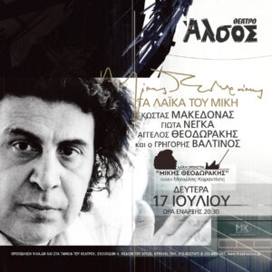 Η Λαϊκή Ορχήστρα «Μίκης Θεοδωράκης» με τους Κώστα Μακεδόνα, Γιώτα Νέγκα, Άγγελο Θεοδωράκη και ο Γρηγόρης Βαλτινός με όπλα τις μοναδικές φωνές των ερμηνευτών και τους εξαιρετικούς μουσικούς – γνώστες του έργου του Θεοδωράκη θα ταξιδέψει το κοινό στον υπέροχο κόσμο της μουσικής του.