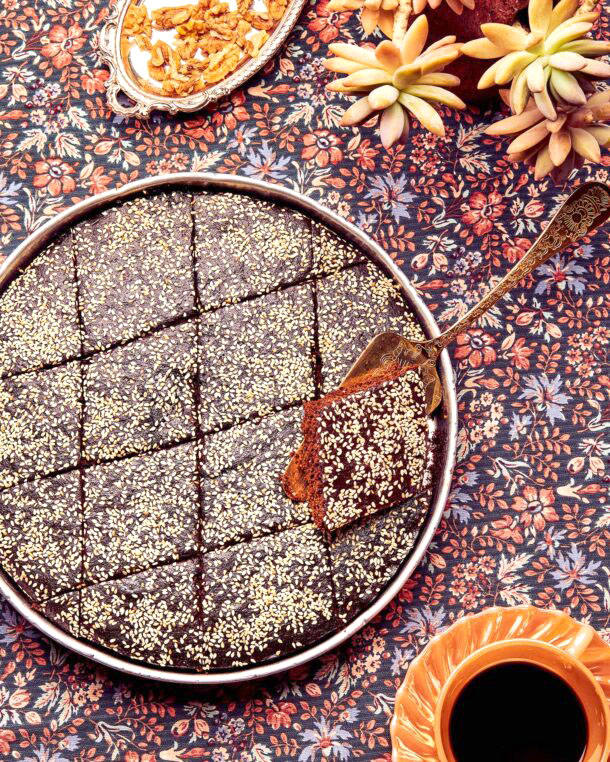 Προθερμαίνουμε τον φούρνο στους 180°C (αντιστάσεις πάνω κάτω) ή στους 160°C (αέρας). Με το ταχίνι αλείφουμε τον πυθμένα και τα τοιχώματα ενός ταψιού ή μιας στρογγυλής φόρμας διαμέτρου 25 εκ..Αν δεν έχουμε ταχίνι, βάζουμε ελαφρύ ελαιόλαδο ή σησαμέλαιο, όμως συνιστούμε το ταχίνι γιατί, εκτός του ότι θα βοηθήσει να μην κολλήσει το γλυκό στο ταψί, χαρίζει και μια ιδιαίτερη, γήινη γεύση.