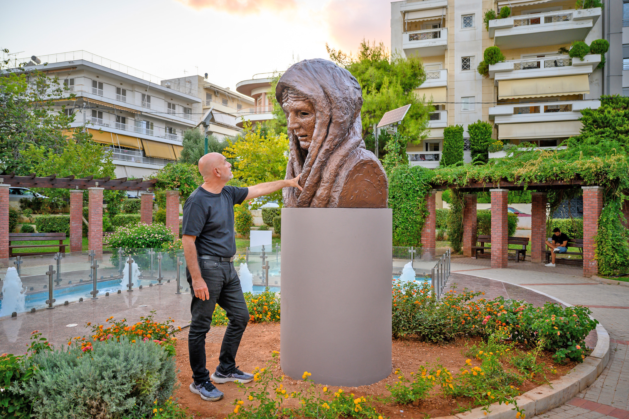 «Πέρασα τα εφηβικά μου χρόνια στη Φιλοθέη και ανέκαθεν θαύμαζα τα γλυπτά που κοσμούν την περιοχή: την μεγάλη προτομή του Παλαμά, τον Μαραθωνοδρόμο, δίπλα του την Κόρη (γλυπτά που βρίσκονται πολύ κοντά στο πατρικό μου όπου διαμένουν οι γονείς μου από το 1977) καθώς και άλλα γλυπτά του Δήμου μας. Έτσι όταν ωρίμασα καλλιτεχνικά, γεννήθηκε μέσα μου η έντονη επιθυμία να συνδράμω με κάποιο τρόπο στον αγαπημένο μου Δήμο. Για αρκετό καιρό έβλεπα το δυναμικό και δημιουργικό έργο του Δημάρχου κύριου Δημήτρη Γαλάνη μέσα από το Instagram. Του έστειλα μήνυμα εκφράζοντας την ιδέα μου, να δωρίσω ένα γλυπτό μου στον Δήμο. Μου απάντησε αμέσως, την επόμενη φορά που θα είσαι στην Αθήνα, έλα από το Δημαρχείο! Κι έτσι έγινε. Συναντήθηκα μαζί του και την Αντιδήμαρχο Δημοτικής Διοίκησης κυρία Ελένη Ζέππου. Τους πρότεινα να επιλέξουν ένα θέμα από τη διεθνή περιοδεύουσα έκθεση «Ελληνικές Κεφαλές», μια θεματική ενότητα που αποτελείται από 6 γλυπτά μεγάλης διάστασης, τα οποία τότε παρουσιάζονταν στην Πρεσβεία της Ελλάδας στην Ουάσιγκτον. Στις 14 Μαΐου 2022, που είναι η επέτειος του εορτασμού της Ευρώπης την έκθεση επισκέφθηκαν περισσότερα από 2.000 άτομα. Παράλληλα γνώρισα τον Αντιδήμαρχο Πρόνοιας Πολιτισμού και Αθλητισμού κύριο Χαράλαμπο Μπονάτσο και έτσι βρέθηκα σε μια αποφασιστική, αποτελεσματική και ευχάριστη ομάδα συνεργατών.