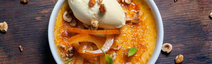 Σερβίρουμε την κρέμα κρύα, με τα καραμελωμένα φουντούκια και το παγωτό βανίλια