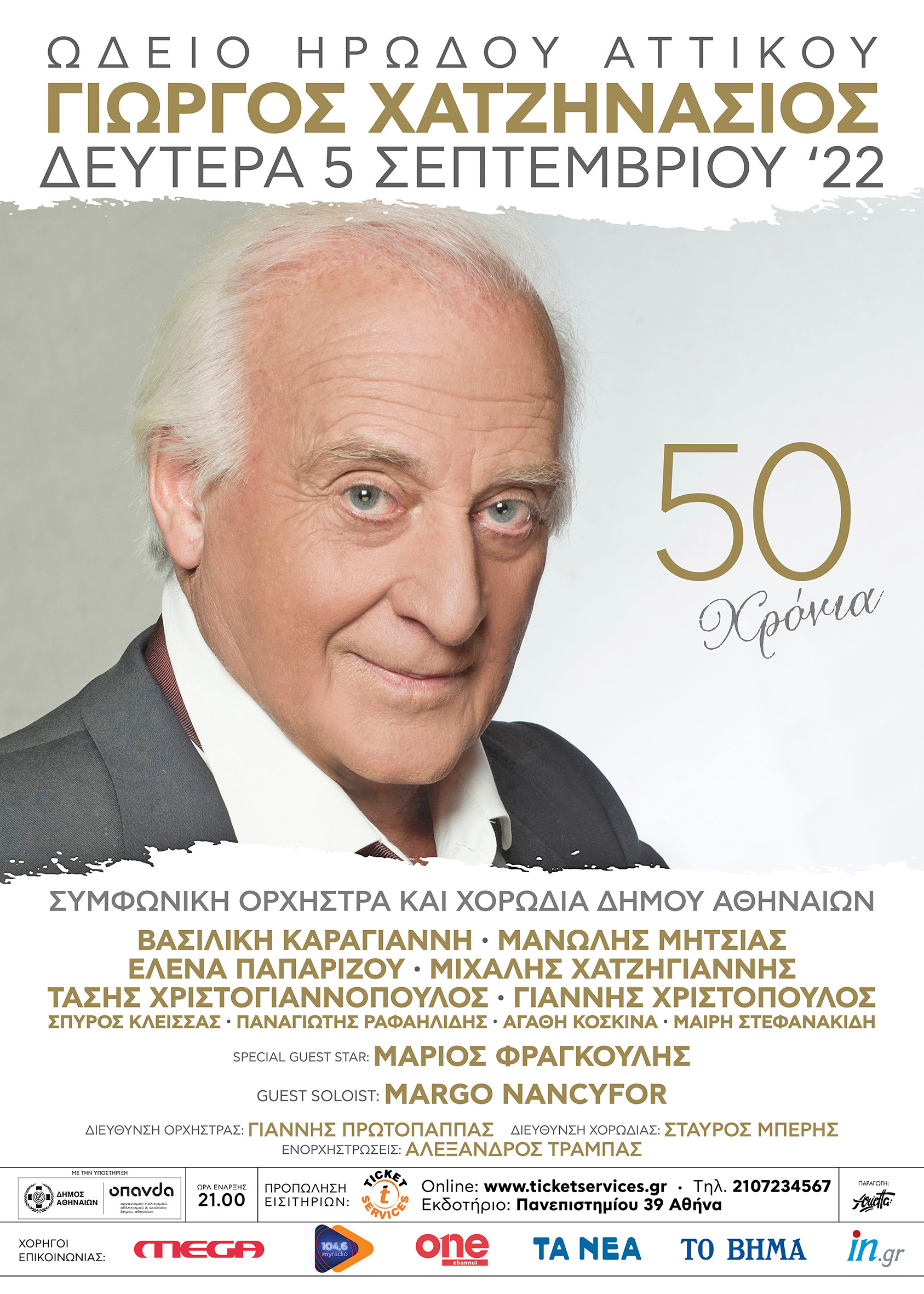 Σε αυτή τη γιορτή θα έχει συνοδοιπόρους εκλεκτούς! Η Βασιλική Καραγιάννη, ο Μανώλης Μητσιάς, η Έλενα Παπαρίζου, ο Μιχάλης Χατζηγιάννης, ο Τάσης Χριστογιαννόπουλος, ο Γιάννης Χριστόπουλος αλλά και οι Σπύρος Κλείσσας, Παναγιώτης Ραφαηλίδης, Αγαθή Κοσκινά, Μαίρη Στεφανακίδη θα είναι στο Ηρώδειο. Special Guest Star ο Μάριος Φραγκούλης. Guest soloist Margo Nancyfor. Συμμετέχει η Συμφωνική Ορχήστρα Δήμου Αθηναίων υπό την Διεύθυνση του Γιάννη Πρωτόπαππα και η Χορωδία του Δήμου Αθηναίων υπό τη διεύθυνση του Σταύρου Μπερή. Ενορχηστρώσεις: Αλέξανδρος Τράμπας.