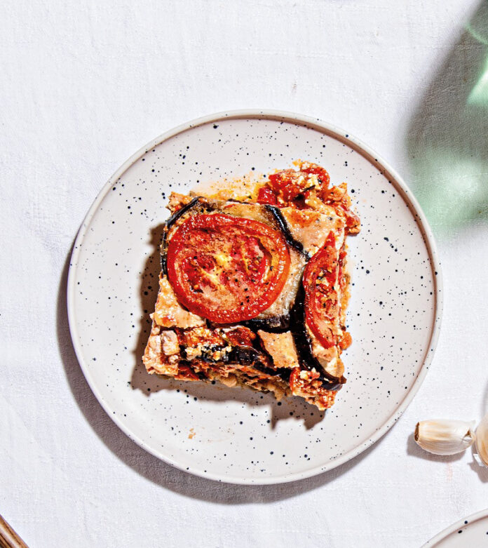 Ανακατεύουμε τα δύο τυριά θρυμματισμένα και πασπαλίζουμε με τη μισή ποσότητα τη μελιτζάνα. Περιχύνουμε με σάλτσα και το μισό μείγμα αυγού. Καλύπτουμε με δεύτερη στρώση μελιτζάνας και πασπαλίζουμε με τα τυριά, τη σάλτσα και το υπόλοιπο μείγμα αυγού. Προσθέτουμε μια ακόμα στρώση μελιτζάνας και ροδέλες ντομάτας.