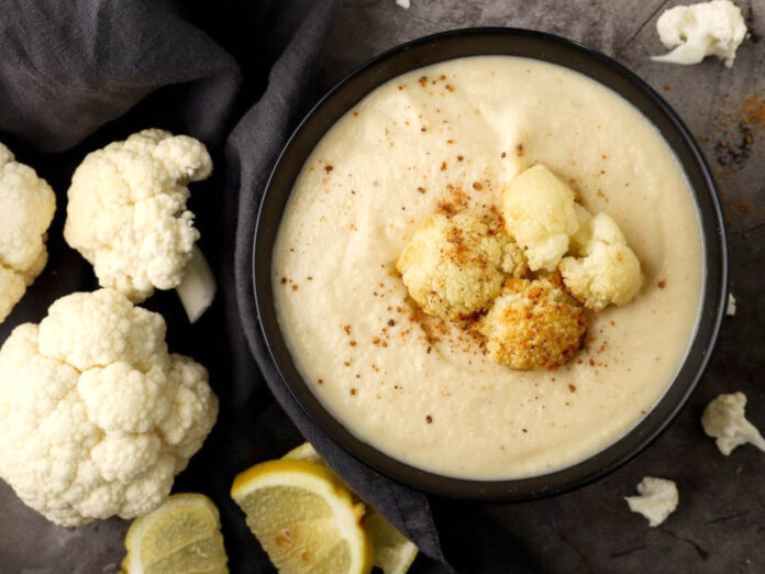 Τέλος, σερβίρουμε τη σούπα ζεστή μαζί με μερικά από τα κομμάτια ψητού κουνουπιδιού που κρατήσαμε.