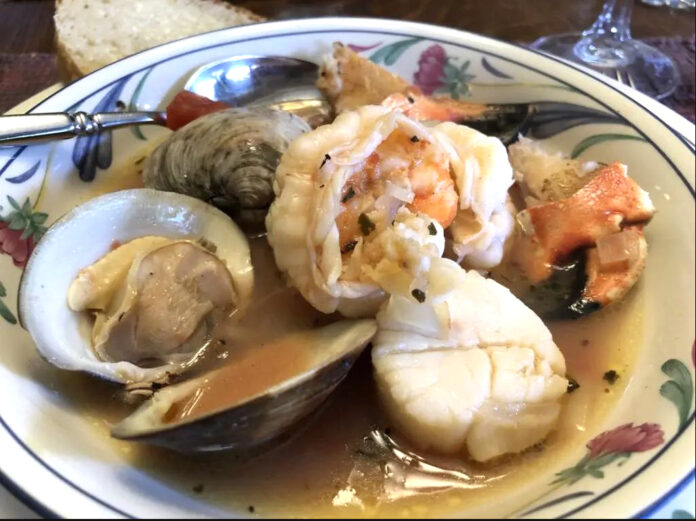 Ανακατεύουμε τα μύδια και τα κυδώνια. Χαμηλώνουμε τη φωτιά σε χαμηλή θερμοκρασία, σκεπάζουμε με ένα καπάκι και μαγειρέψτε μέχρι τα μύδια και τα κυδώνια να αρχίσουν να ανοίγουν, περίπου 3-4 λεπτά. Ανακατεύουμε τον μπακαλιάρο, τις γαρίδες και τα χτένια. Μειώνουμε τη φωτιά και σιγοβράζουμε μέχρι ο μπακαλιάρος, οι γαρίδες και τα χτένια να ψηθούν και τα μύδια να ανοίξουν εντελώς, περίπου 3-4 λεπτά. Εννοείται ότι πετάμε τα μύδια που δεν έχουν ανοίξει.