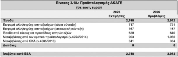 Τώρα, με θλίψη εντοπίσαμε στη σελ. 167 της Εισηγητικής Έκθεσης του κρατικού προϋπολογισμού για το 2026 και στον Πίνακα 3.18 ότι το ποσό που θα πληρώσουν υπέρ ΕΑΣ οι συνταξιούχοι θα είναι κατά 4 εκατ. € μεγαλύτερο σε σχέση με το 2025 και ότι η βασική πηγή εσόδων για τον προϋπολογισμό του ΑΚΑΓΕ θα προέρχεται και το 2026 (όπως και τα προηγούμενα χρόνια) από την παρακράτηση της Εισφοράς Αλληλεγγύης Συνταξιούχων, σύμφωνα με ισχύοντες ακόμη μνημονιακούς νόμους (ν. 3865/2010, 3986/2011, 4002/2011).