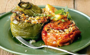 Γεμίζουμε κάθε λαχανικό μέχρι τα 3/4, γιατί θα φουσκώσει το ρύζι με το ψήσιμο. Βάζουμε τα καπάκια και τα αραδιάζουμε σε βαθύ ταψί, το ένα κοντά στο άλλο. Σε ένα μπολ χτυπάμε με σύρμα την υπόλοιπη αλεσμένη ντομάτα με το υπόλοιπο 1 φλ. ελαιόλαδο. Αλατοπιπερώνουμε και μ’ ένα κουτάλι περιχύνουμε το ταψί. Τέλος, ανακατεύουμε τη φρυγανιά με τη ζάχαρη και πασπαλίζουμε τα γεμιστά. Τα ψήνουμε σε προθερμασμένο φούρνο στους 180°C στις αντιστάσεις, το πρώτο μισάωρο σκεπασμένα. Έπειτα, αφαιρούμε και συνεχίζουμε το ψήσιμο, που συνολικά διαρκεί 1 ώρα και 15΄.