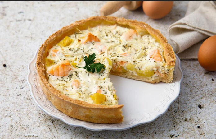 Τοποθετούμε το σολομό, τη ρικότα, τον άνηθο, τα αυγά και το γάλα σε ένα μπολ και τα ανακατεύουμε, αλατοπιπερώνοντας καλά. Ρίχνουμε απαλά το μείγμα σολομού στη μαγειρεμένη βάση τάρτας. Μεώνουμε τη θερμοκρασία του φούρνου στους 160 βαθμούς και ψήνουμε για 35 λεπτά ή μέχρι να σταθεροποιηθεί η γέμιση. Σερβίρουμε σε φέτες τη τάρτα συνοδευόμενες από πράσινη σαλάτα και φέτες λεμονιού.