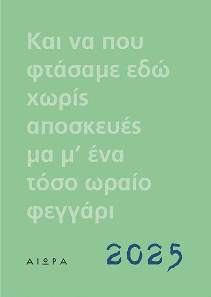 Ως τίτλο στο Ημερολόγιο της Αιώρα για το 2025 επιλέξαμε τον στίχο του Τάσου Λειβαδίτη «Και να που φτάσαμε εδώ χωρίς αποσκευές / μα μ’ ένα τόσο ωραίο φεγγάρι», από το ποίημα «Αλλά τα βράδια».