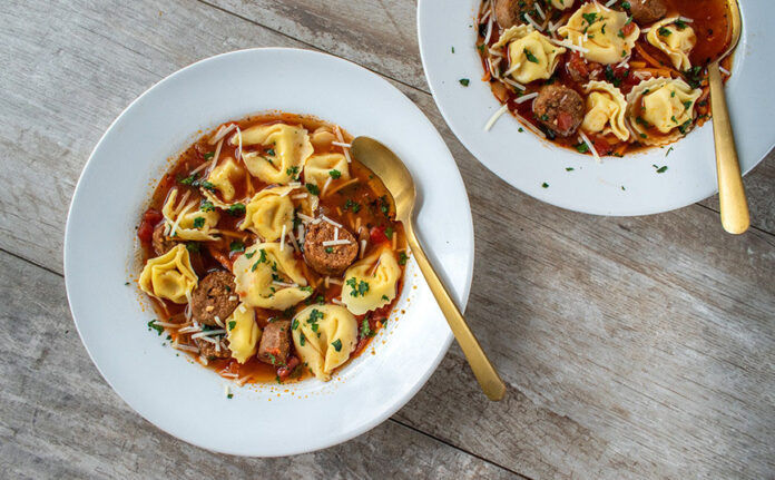 Ετοιμάστε τα τορτελίνια σύμφωνα με τις οδηγίες της συσκευασίας. Στο μεταξύ, σε ένα μεγάλο τηγάνι μαγειρέψτε το λουκάνικο σε μέτρια φωτιά μέχρι να μην είναι πλέον ροζ, 6- 8 λεπτά, σχεδόν θρυμματίζοντάς το. Προσθέστε τη σάλτσα ζυμαρικών και ανακατέψτε. Αφήστε να πάρει μια βράση.
